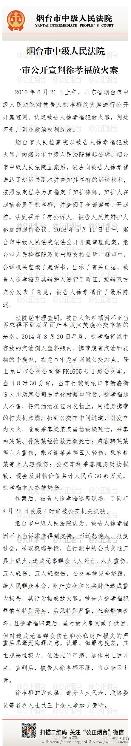 中新网6月21日电 据山东省高级人民法院官方微博消息,今日上午,山东省烟台市中级人民法院对被告人徐孝福放火案进行公开开庭宣判,认定被告人徐孝福犯放火罪,判处死刑,剥夺政治权利终身。