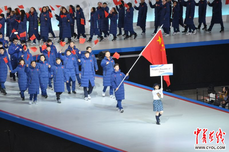 第八届亚冬会开幕式,中国代表团入场。中国的旗手是短道速滑运动员武大靖。中国青年报·中青在线记者 慈 鑫/摄