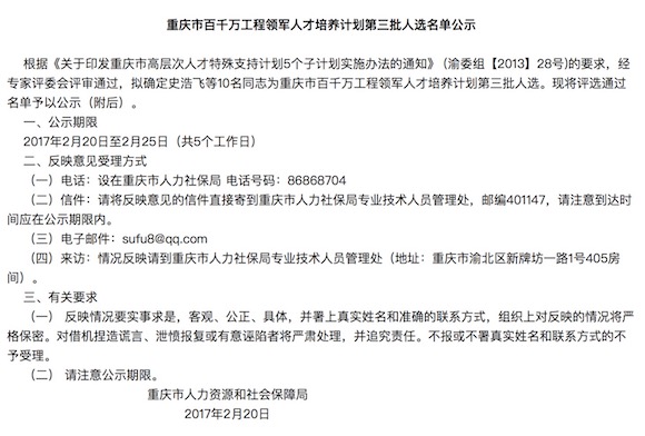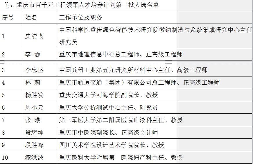 记者从重庆市人社局了解到,经专家评委会评审通过,拟确定史浩飞等10人为重庆市百千万工程领军人才培养计划第三批人选,名单正在公示,公示期限为2月20日至2月25日。