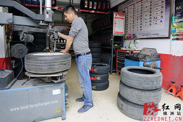 在石峰区人民北路的“小伙伴汽车服务中心“,店主陈功正在修补汽车轮胎。他上身仅穿一件长袖T恤,袖口已经撸到了上臂,额头上已满是汗珠。脚下还有数堆等待修复及更换的轮胎。“春节回来基本都没有空闲,修了这么多年的车,就没见过每天这么多车需要修的,每天基本都忙到晚上11点才下班。”