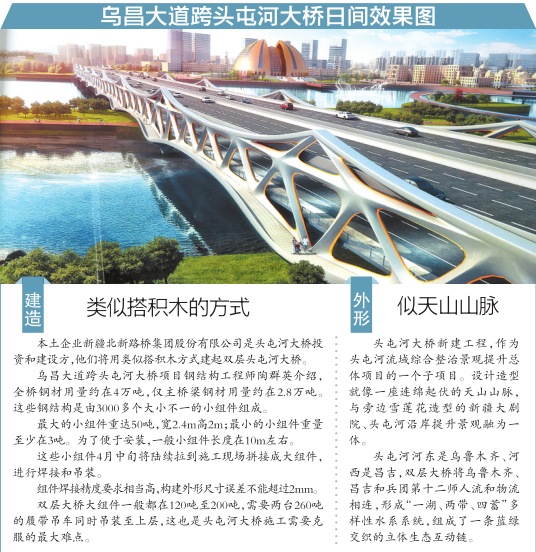 (记者李宁艳 马婷)全疆首座双层钢桁架桥——乌昌大道跨头屯河大桥(下称头屯河大桥)工程日前已全面复工,最快10月底将建成通车。