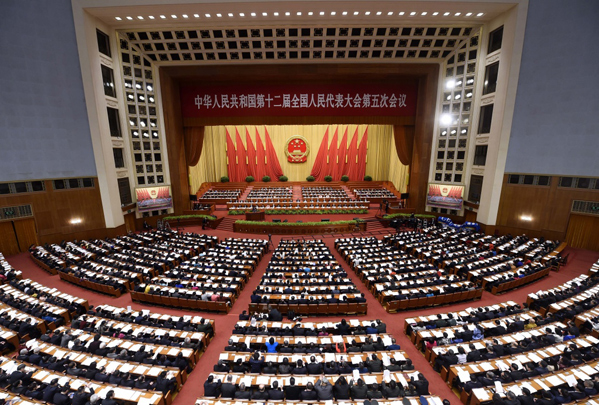 3月12日,十二届全国人大五次会议在北京人民大会堂举行第三次全体会议(新华社记者 燕雁 摄)