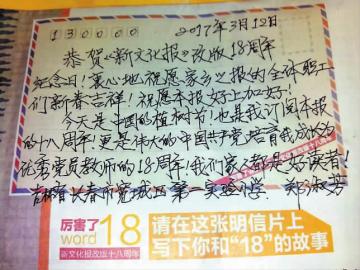 “恭贺《新文化报》改版18周年纪念日!衷心祝愿家乡之报的全体职工们新春吉祥!祝愿本报好上加好!今天是中国的植树节!也是我订阅本报的十八周年!更是伟大的中国共产党培育我成长为优秀教师的18周年!”这是长春市宽城区第二实验小学郑淑芳老师传来的明信片内容。郑老师今年54岁,订阅新文化报已经18年了,对本报有着深厚的感情,这次看到本报留白的征集,亲笔写下了自己的祝愿。
