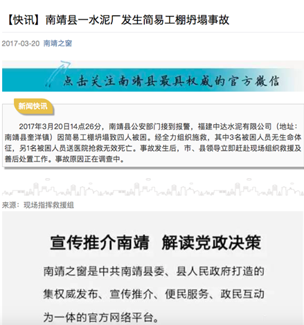 中青在线福州3月20日电(中国青年报·中青在线记者 林智仁)记者从中共福建南靖县委宣传部主办的微信公众号“南靖之窗”了解到,今天14点26分,南靖县公安部门接到报警,位于南靖县奎洋镇的福建中达水泥有限公司因简易工棚坍塌致四人被困。经全力组织施救,其中3名被困人员无生命体征,另1名被困人员送医院抢救无效死亡。事故发生后,市、县领导立即赶赴现场组织救援及善后处置工作。