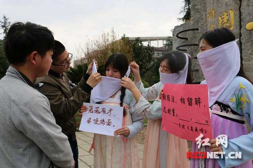 红网衡阳3月27日讯(通讯员 李谌涵 陈玉娴)3月27日,南华大学校园出现“蒙面汉服美女”,引起了众多同学围观。汉服美女们的手中举着空缺的诗词求答案。答对诗句,汉服美女们就揭下面纱。她们通过这种方式,吸引同学们参加诗词比赛。
