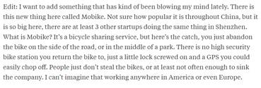 这名网友还拿最近在中国很热的“共享单车”举了个例子。共享单车的破坏情况最近在中国社会引发了不少争议,“中国人就是素质低”的声音再次频频爆发。不过在这位美国网友眼里全完全不是这样,“(在中国)你只需要把自行车放在路边或公园里就可以了,而不是必须把它们存放在高度安全保障的自行车站里。人们竟然不偷车,或者说最起码偷盗行为没有严重到让公司破产的程度。我没法想象这种模式能在世界任何地方运行下去,哪怕是美国和欧洲。”