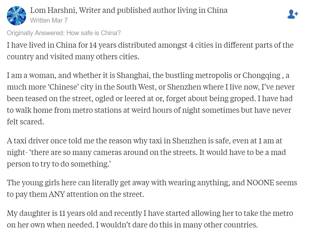 一位网名叫David Riordan的Quora用户这样写道,“我在北京和沈阳住了快两年。之前我还曾在爱尔兰、德国和美国都生活过。至少到目前为止,我觉得中国是最安全的国家。我没法从女性的角度说太多,但作为男人,我可以说在中国我只有唯一一次看见过有人处于危险之中:那是一个人喝得烂醉,当时他对周围的中国人和我们老外都构成了威胁。”这条短短的帖子获得了超过100万阅读量和1500多个“赞”。