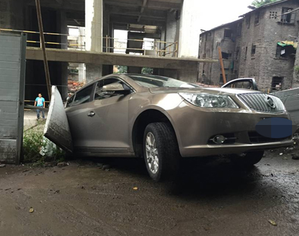 近日,一辆轿车在重庆陈家坪气象台支路陡坡调头倒车时,车辆失控冲破路边挡墙,由于墙外是一个在建筑工地,两处地势落差两层楼高。该车大半个车身悬在空中,仅依靠驾驶室车门和右后车门“挂靠”在挡墙上,四个车轮悬空,车身晃荡,摇摇欲坠……该车驾驶员王某和妻子经历了这样的惊魂一幕,所幸二人均未受损。