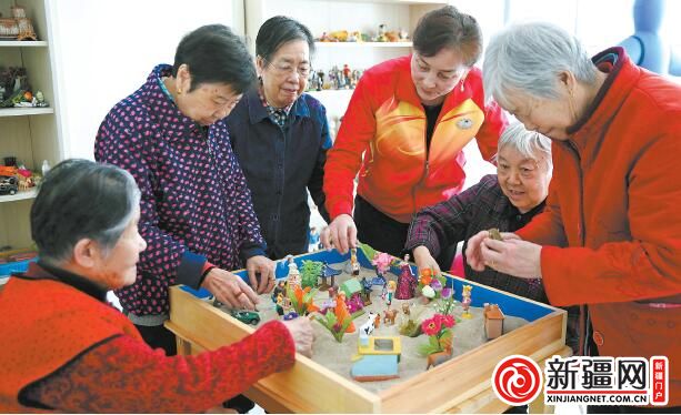 社工迪丽努尔·吐尔地(右三)和老人在沙盘上摆放各种玩具和物品。(记者刘志龙摄)