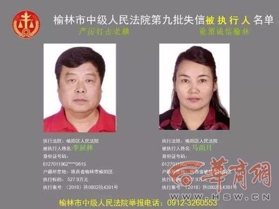 今年3月20日,榆林中院公开曝光“第九批失信被执行人名单”,李延林、马尚月夫妇名列其中,执行标的为527.9万元。