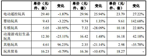 2014年至2016年电动遥控玩具单价分别为23.79元、29.96元、29.40元;婴幼玩具单价分别为9.61元、9.74元、9.43元;车模玩具单价分别为10.18元、7.32元、5.05元;动漫游戏衍生品玩具单价分别为16.18元、16.42元、12.30元;其他玩具单价分别为2.98元、2.35元、4.61元。