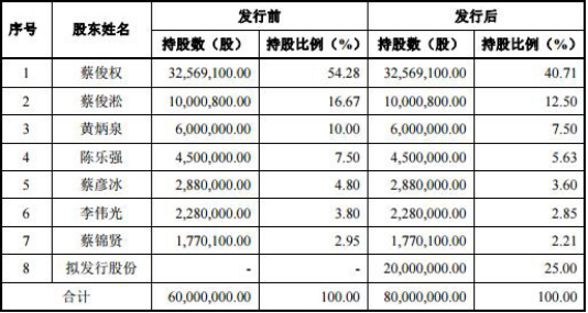 公司的实际控制人为蔡俊权,直接持有本公司3,256.91万股,占公司总股本的54.28%,本次发行完成后,蔡俊权直接持有本公司40.71%的股份,蔡俊权为中国国籍,无境外永久居留权。