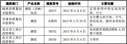 2012年3月,上海质监局发现实丰文化所产的搪胶玩具(规格型号:58557)存在质量问题,公示不合格项为“挤压玩具、摇铃及类似玩具”,公司进行整改才获得通过。同年7月,在中国国家认证认可监督管理委员会产品质量监督抽查中,公司所产搪胶玩具(规格型号:58530)在新疆市场上被抽检不合格,存在小零件等项目不符合有关标准要求的问题,经整改和召回,此事才得以平息。