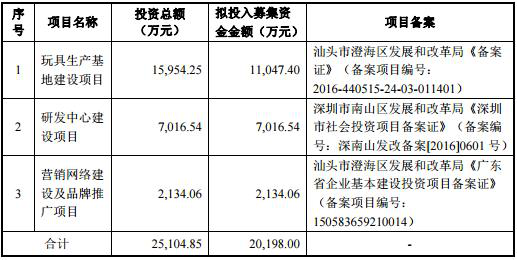 1.玩具生产基地建设项目,投资总额15,954.25万元,拟投入募集资金金额11,047.40万元;2.研发中心建设项目,投资总额7,016.54万元,拟投入募集资金金额 7,016.54万元;3.营销网络建设及品牌推广项目,投资总额2,134.06万元,拟投入募集资金金额2,134.06万元。