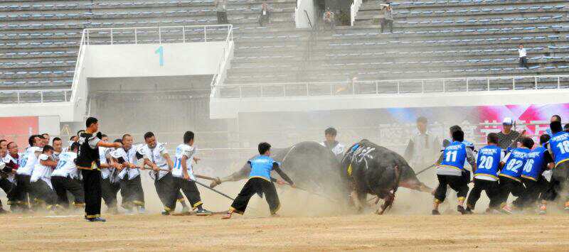黔东南州斗牛历史悠久,斗牛在当地是一项十分重大的节庆活动。区别于西班牙的“人斗牛”,这种“牛斗牛”的比赛以其力大威猛而更显惊心动魄。去年10月,凯里市举办了第一届“牛霸天下”国际斗牛标准赛,聚集了来自国内和缅甸、越南等国家的牛王,可谓是“高手如云”。今年,第二届“牛霸天下”斗牛赛将提前到4月29日至5月1日举行,除了贵州本地,目前已有来自广西、云南以及越南、缅甸等国的牛王报名参赛。届时,在凯里市华恺城将上演一场“牛气冲天”的精彩比赛。凯里市刚刚才获得中国少数民族文化艺术促进会颁发的“东方斗牛城”荣誉称号,比赛中,设立了很多专业化、标准化的措施,比如给斗牛注册、裁判持证上岗。此外,当地斗牛协会加强行业领导,力求将“牛霸天下”斗牛赛打造成凯里市的一张旅游文化名片。本届斗牛比赛分为轻量级、中量级和重量级三个组别,每个组别取前四名颁奖,另外,还设置了“勇猛碰撞”、“东方神抠”等奖项。最终,到底哪几头力大无穷又能征善战的“猛牛”能执“牛霸天下”之牛耳?巨大的悬念激起了观众强烈的好奇心。