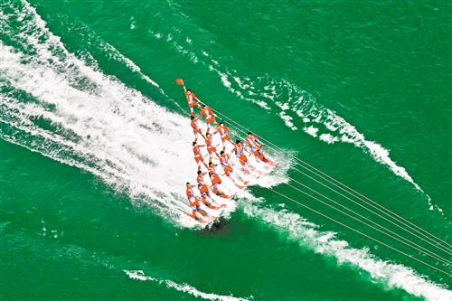 5月3日,中国队选手正在表演水上“叠罗汉”。当日,为期3天的2017中美澳艺术滑水明星对抗赛在彭水开赛,来自中国、美国、澳大利亚三国的顶级滑水选手在乌江水面展开精彩角逐。 特约摄影 杨敏