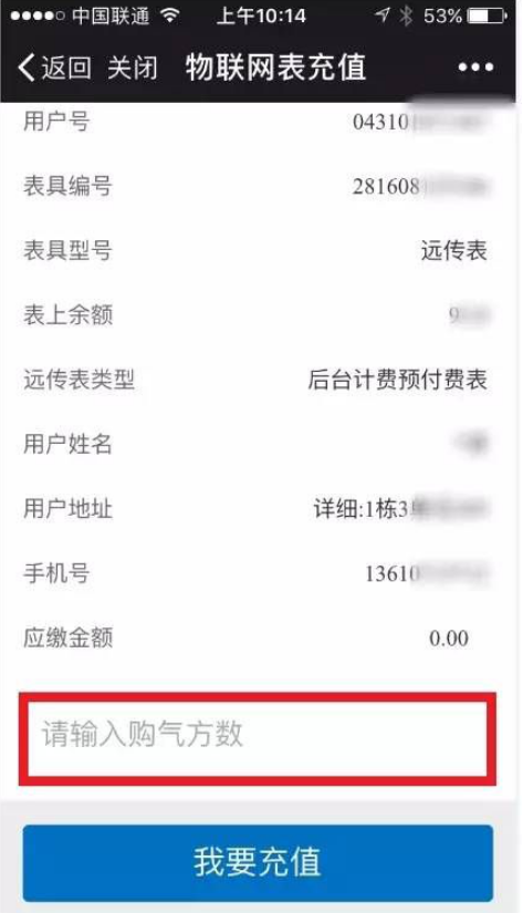 5、在物联表充值界面显示用户信息,核实信息,准确无误后请输入购气方数,点击“我要充值”即可。