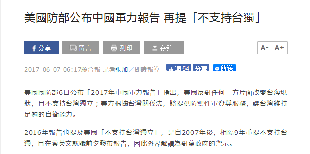 台湾《联合报》称,五角大楼2016年“中国军力报告”也提及美国“不支持台湾独立”,是自2007年后,相隔9年重提不支持台独,且在蔡英文就职前夕发布报告,因此外界解读为对蔡当局的警示。