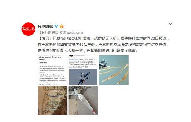 【快讯!巴基斯坦枭龙战机击落一架伊朗无人机】据美联社当地时间20日报道,在巴基斯坦俾路支省境内45公里处,巴基斯坦空军枭龙发射霹雳-5空对空导弹,击落进犯的伊朗无人机一架,巴基斯坦国防部也证实了此事。