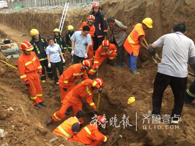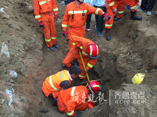 消防队员到场后发现1个工人被埋在土里,现场的工人正在施救。