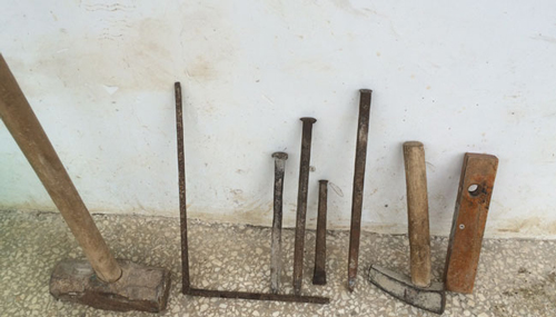 雕刻打磨石头时,传统石匠所需要的工具有:手锤、二锤、錾子、钢钎、三尺方、铁弯尺、水平尺、墨斗。石匠根据要做的石具类型、大小来选择石料,硬度大的石料最好;开采石料是个力气活,野外的石头大都形体巨大且不规整,石匠拿出铁弯尺、三尺方来确定长、宽、高,再用墨斗在石头上做好标记;然后用錾子敲出一个个小坑,将钢钎放入坑中,用二锤敲打钢钎,生生地将石料分割开来。
