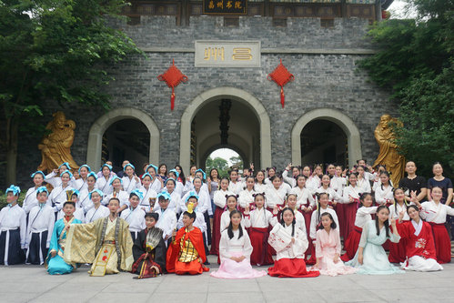 重庆市大足区昌州古城前一群身穿汉服的少年在朗诵诗词。特约通讯员 邓小强 摄