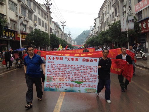 “无事酒,可耻酒,誓抵制,绝不走”“抵制无事酒,发扬新风尚”……当日,在阵阵腰鼓声中,部分居民积极加入到宣传活动中。有的抬宣传展板,有的牵标语,有的举彩旗,有的用喇叭讲解……