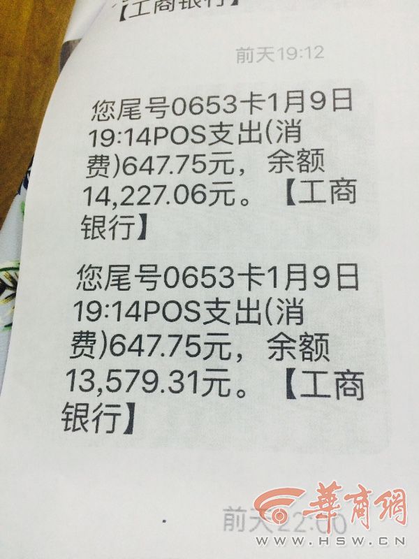 韩先生提供的信息显示,其收到了同数额的两笔银行扣款短信,一条为“卡1月9日19:14POS消费647.74元,余额14227.06元”,另一条是“卡1月9日19:14POS消费647.74元,余额13579.31元。”其账户历史明细单也显示两笔647.74元支出。
