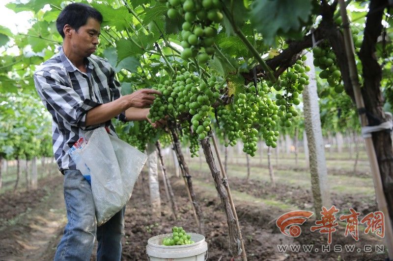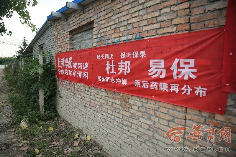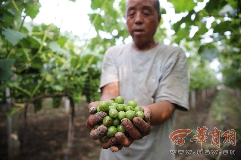 6月21日下午,在户县黄堆村,可以看到葡萄地的沿路上贴满了各种品牌的农药广告,主要就是治疗“黑粒”病害。在葡萄园里,很多村民背着袋子拿着桶,将已经发黑变硬的果粒从葡萄穗上摘除,有的人为了便捷,用手摇晃葡萄穗后几乎有三分之一的发黑葡萄脱落掉在地上。