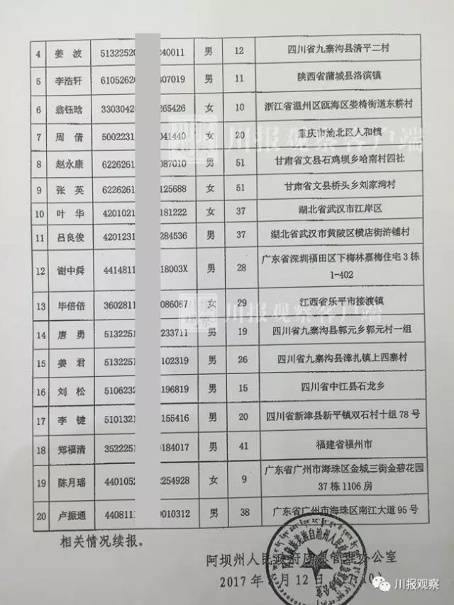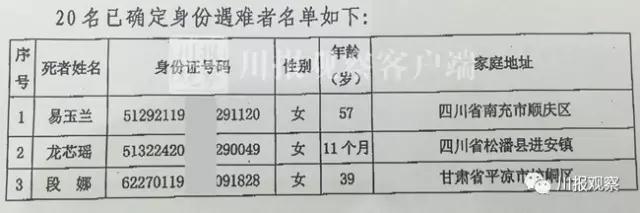 8月12日,记者从四川省政府新闻办获悉,截至8月12日16时50分,新增确认九寨沟7.0级地震遇难者身份6名。死亡的24人中,已有20人确定身份,其余4名正在核实身份,已确定遇难者身份如下: