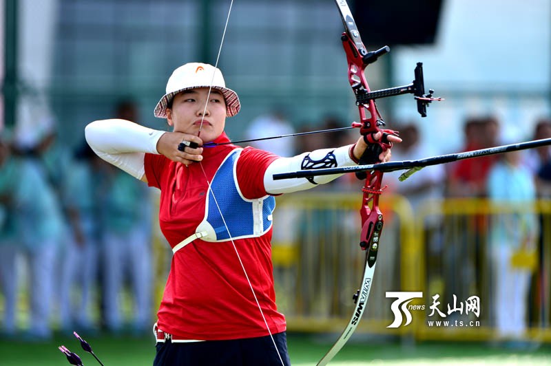 天山网天津讯(记者张新军摄影报道)8月31日,第十三届全国运动会(以下简称全运会)女子射箭70米个人赛在天津团泊射箭场举行,新疆小将李新鑫获得第四名。