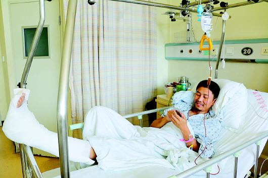 病床上的李延军腿上绑着绷带,正在和朋友聊天。