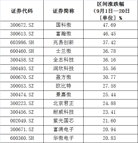 芯片板块部分个股9月以来涨幅
