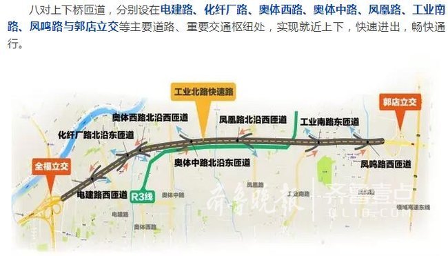 工业北快速路全长13.6公里西起全福立交,东至郭店立交连接北园、二环东快速路与东绕城高速城市快速路网重要组成部分