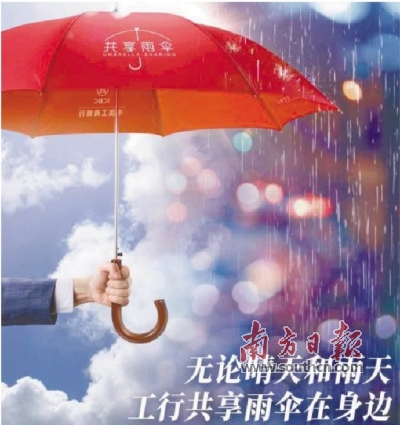 广东地处亚热带季风气候区,大半年高温多雨,多变的天气给市民带来许多出行的不便和尴尬。从中国工商银行东莞分行获悉,为方便市民遮阳挡雨,继6月底中国工商银行在广州地区试点推出共享雨伞服务后,工商银行广东省分行近日宣布,自9月25日起,该行将率先在辖内全面推出共享雨伞便民服务,无论是否为工行客户,只要走入工行网点就能免费借伞。据了解,该行是工行系统内和同业首家在全省范围内推出共享雨伞服务的省级分行。