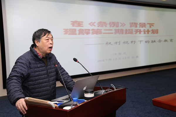 教育部高等学校特殊教育教师教育教学指导委员会副主任、中国教育学会特殊教育分会秘书长、北京联合大学特殊教育学院原院长、北京联合大学教授、全国特殊教育知名专家许家成做了题为《在〈条例〉背景下理解第二期提升计划——权利视野下的融合教育》的报告。