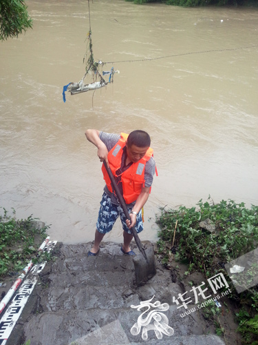 虽然后来改用浮标法施测流量,测验工作受的影响不大,可停在河心的缆道依然纠结着谭波和同事的心。来电后,在水流速的作用下,电机根本无法拖动缆道。谭波凭着较好的水性,待水位稍退后,只身一人划着简易橡皮船到达了河心,他用镰刀一点一点地清理着挂在绳索上的漂浮物。3个小时过去了,他成功将缆道拉回了河岸,避免了一起安全事故的发生。
