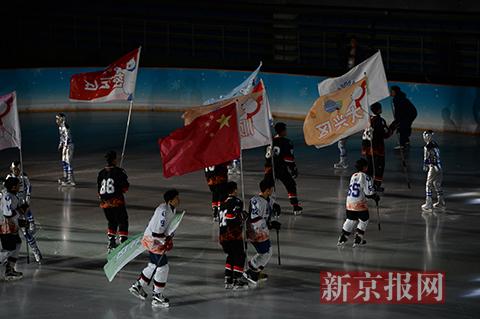 各区县代表队的旗帜在冰场上飘扬。新京报记者 吴江 摄