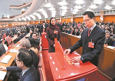 | 3月11日,十三届全国人大一次会议在北京人民大会堂举行第三次全体会议。这是代表投票表决中华人民共和国宪法修正案草案。新华社发 |