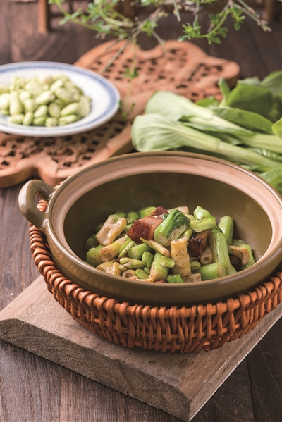 老咸菜焖蚕豆 春天的蚕豆青绿鲜嫩,粒大饱满,采用新鲜带壳蚕豆与自制咸菜共同焖炒,蚕豆特有的鲜香味与咸菜搭配,愈嚼愈有滋味。