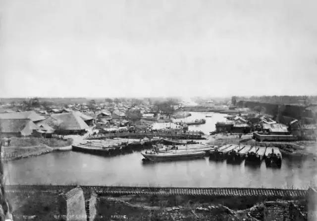 1870年,东便门外大通桥、通惠河(在外城东段北垣外这段即为外城护城河)、内城护城河(近处)。大通桥内外是漕运转运码头,可见桥西侧的驳船,此时外城东北角楼还完好。 摄影:(英)托马斯·查尔德