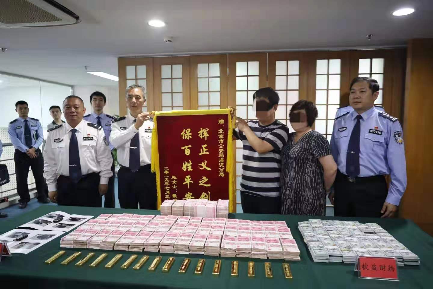 海淀警方向事主发还被盗现金和金条。新京报记者 王飞 摄