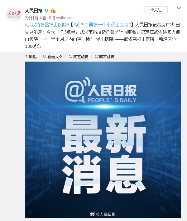 人民日报记者贺广华 田豆豆消息:今天下午3点半,武汉市防疫指挥部举行调度会,决定在武汉蔡甸火神山医院之外,半个月之内再建一所“小汤山医院”——武汉雷神山医院,新增床位1300张。