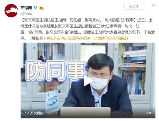 近日,上海医疗救治专家组组长张文宏医生提出最新复工3大注意事项:防火,防盗,“防”同事。张文宏再次金句频出,提醒复工期间大家容易忽略的细节,干货满满。(燃新闻)