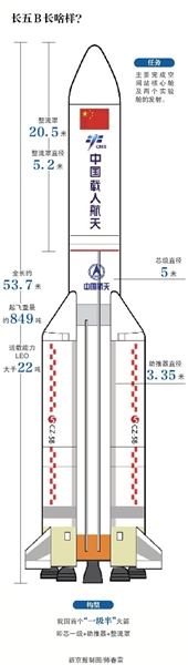 长五B被称为中国第一个“一级半”火箭。“一级半”是指在火箭的一级上捆绑四个助推器,助推器即“半级”。而长五由一级、二级和助推器组成,是“二级半”。缩减一级,长五B比长五矮了3米,但更重要的差别是用途。