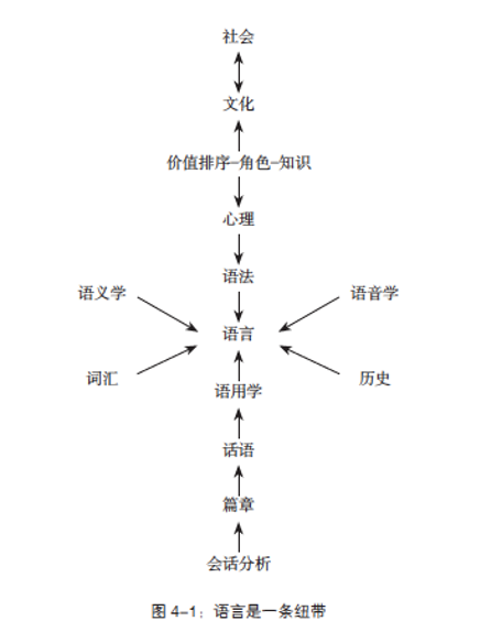 无论其生物基础如何,语言都是由心理、历史和文化所塑造的。这里解释一下图4-1 的含义。