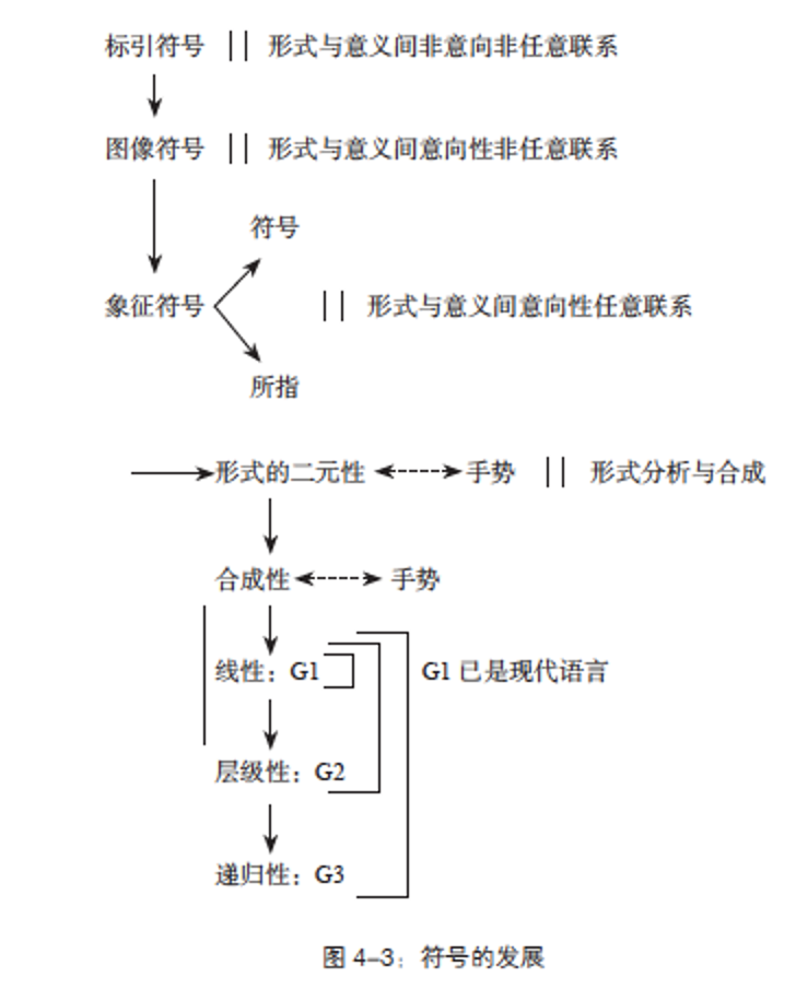不过,如果语法是稍后出现的,那么最先出现的是什么?基本上,人属在走上语言道路之前需要两个先于语法的基础性发展。我们是通过化石记录了解到这一点的。在古生物学记录中,图像符号、标引符号和象征符号先于语法出现,就像符号发展理论所推测的那样。第二,文化出现的前提部分表现在象征符号出现时必定是意向性的和约定俗成的。最后,世界上也存在不具备结构依赖性语法的语言。语言的进化遵循图4-3 所示的“符号发展”的路径,在此处重复一下。