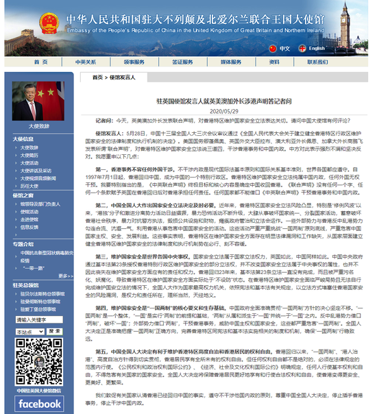 原标题:驻英国使馆发言人就英美澳加外长涉港声明答记者问