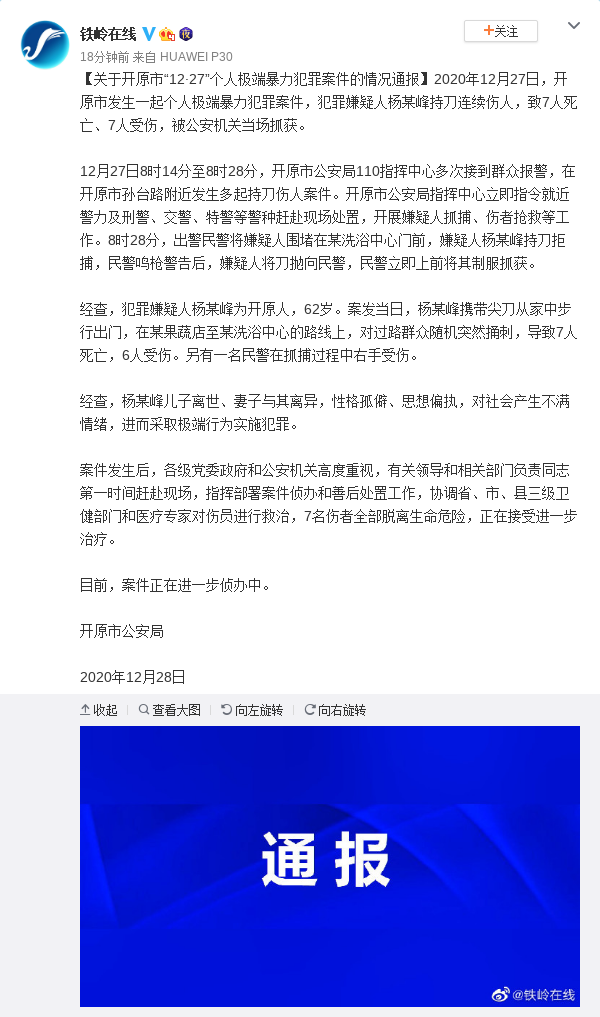 原标题:关于开原市“12·27”个人极端暴力犯罪案件的情况通报