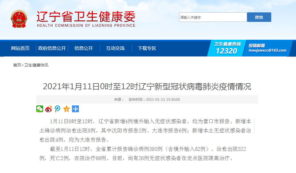 1月11日0时至12时,辽宁省新增4例境外输入无症状感染者,均为营口市报告。新增本土确诊病例治愈出院8例,其中沈阳市报告2例、大连市报告6例;新增本土无症状感染者治愈出院4例,均为大连市报告。